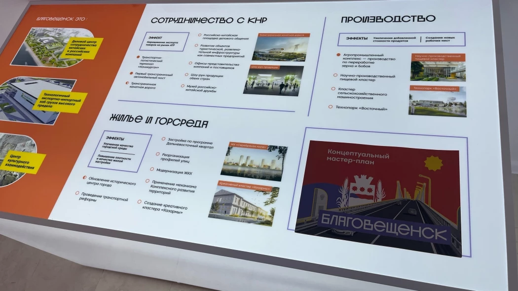 В рамках деловой программы Восточного экономического форума-2022 в павильоне Амурской области был представлен мастер-план Благовещенска, включающий в себя ключевые идеи и направления возможного развития города в течение ближайших лет. Часть из заявленных проектов уже находятся в стадии реализации. Например, в настоящее время ведутся работы по строительству канатной дороги, которая должна соединить Благовещенск и соседствующий с ним китайский город Хейхэ, создание логистических и таможенных терминалов.