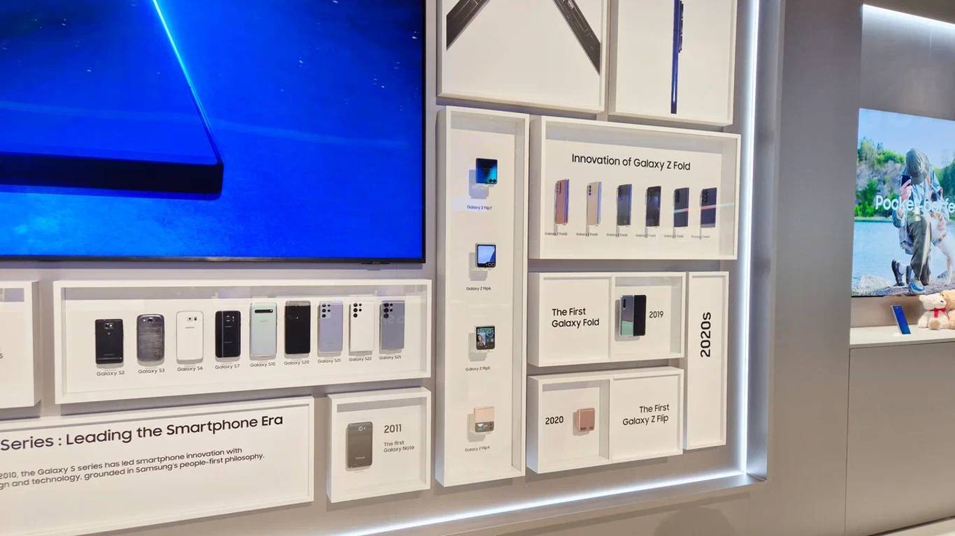 Отдельная зона была посвящена складным устройствам Galaxy Z Fold и Galaxy Z Flip. Здесь наглядно продемонстрирована трансформация от первых экспериментальных моделей до ультратонких корпусов с интеграцией ИИ в Galaxy Z Fold7.